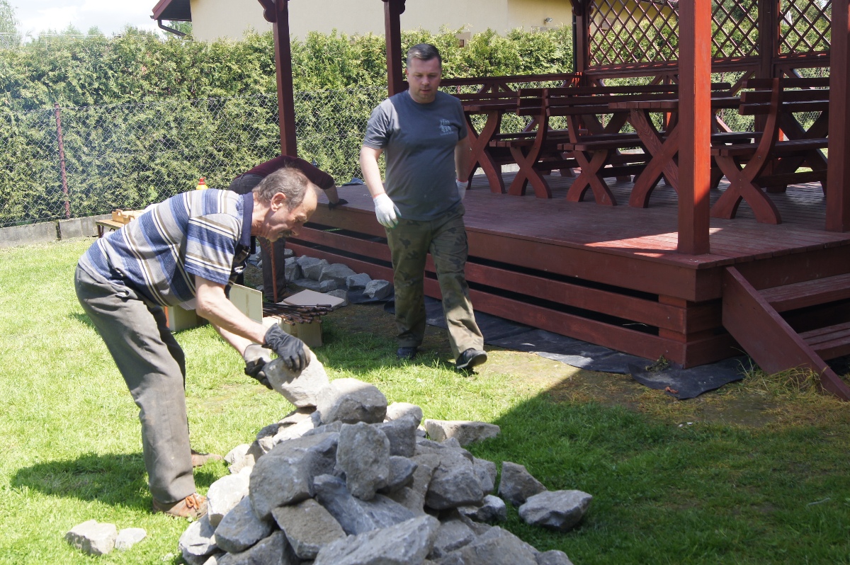 - na macie zabezpieczającej przed zarastaniem trawą wokół altany ułożono głazy