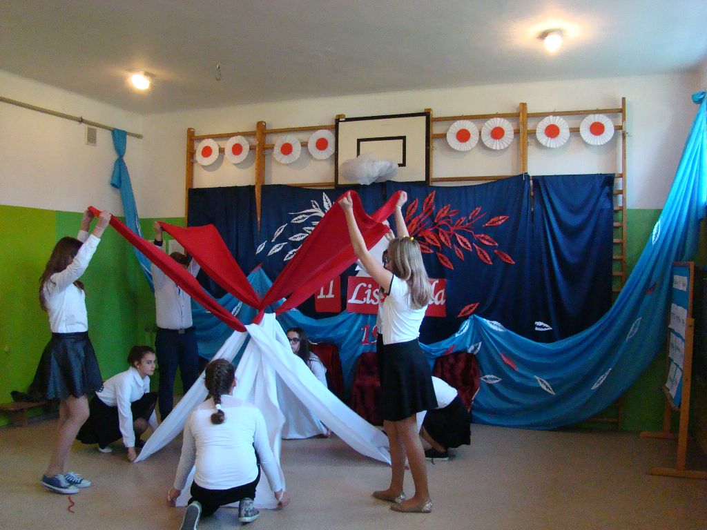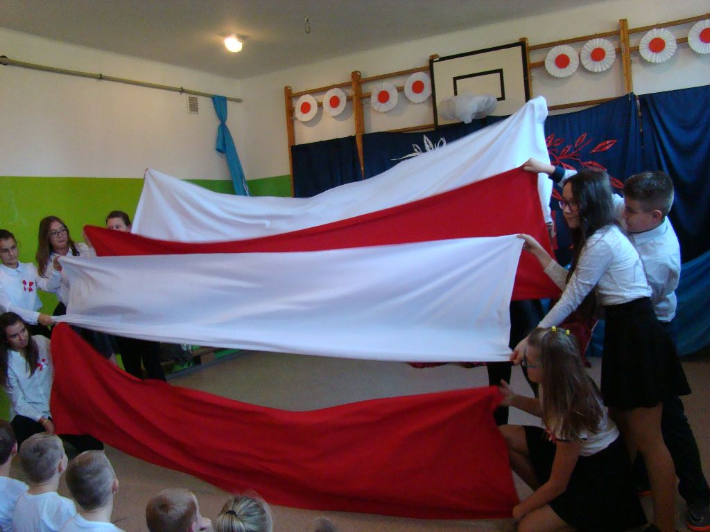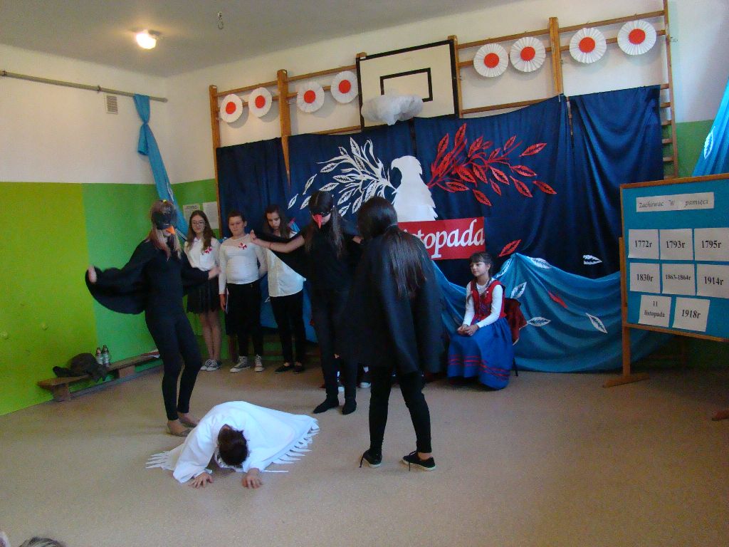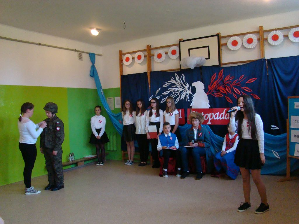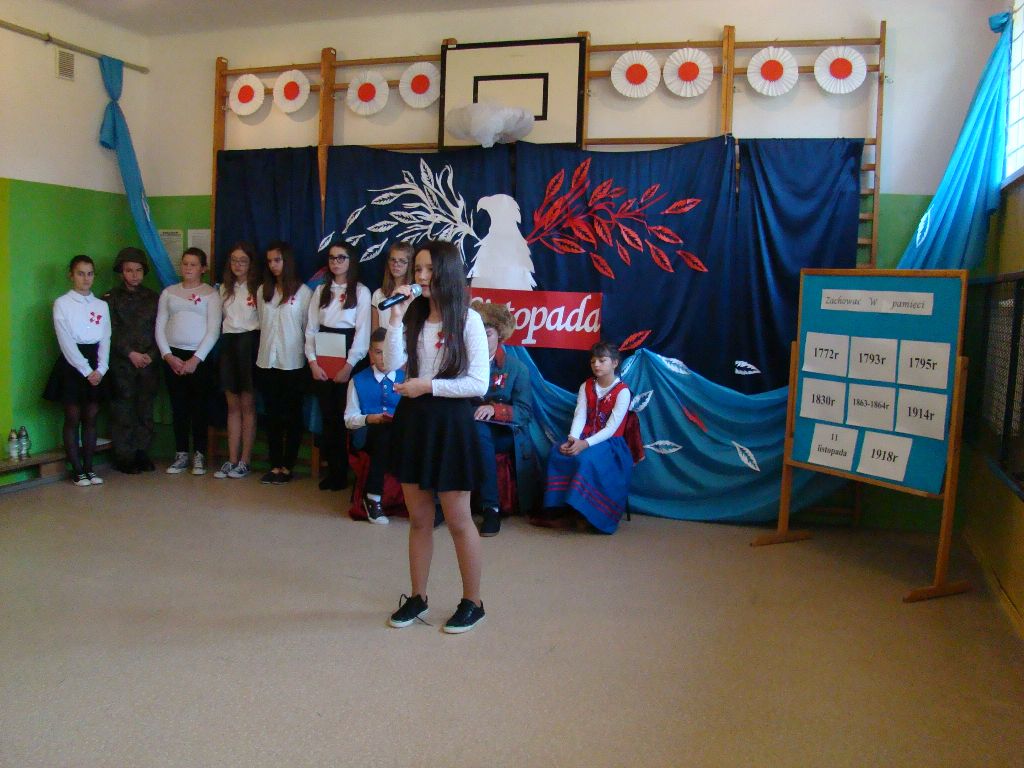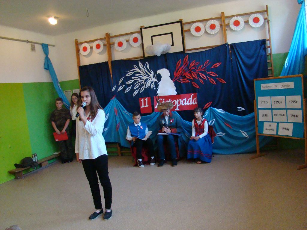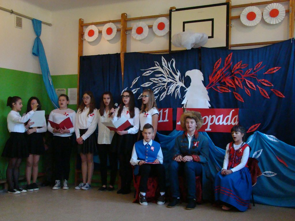 Akademię rozpoczęto od uroczystego odśpiewania hymnu państwowego. Następnie uczniowie klasy IV, VI, VII i VIII zaprezentowali montaż słowno – muzyczny. Młodzi artyści przedstawili treści historyczne, przypomnieli śpiewem, wierszem i tańcem najważniejsze wydarzenia z naszej burzliwej historii. Przedstawiony program artystyczny dostarczył wszystkim uczestnikom wielu emocji i wzruszeń, oddając tym samym hołd naszej Ojczyźnie. Był wyrazem wdzięczności i uznania dla wszystkim tych, którzy walczyli i ginęli za naszą wolną Polskę.