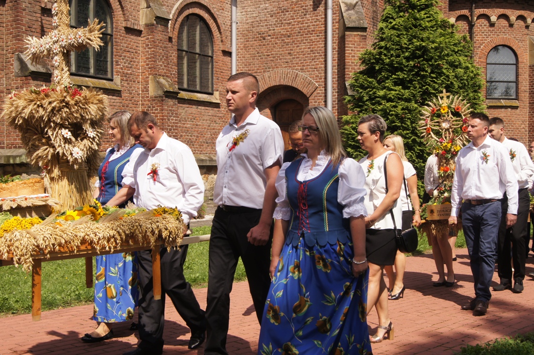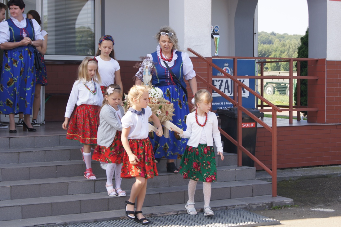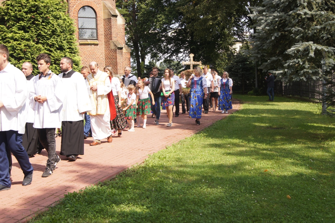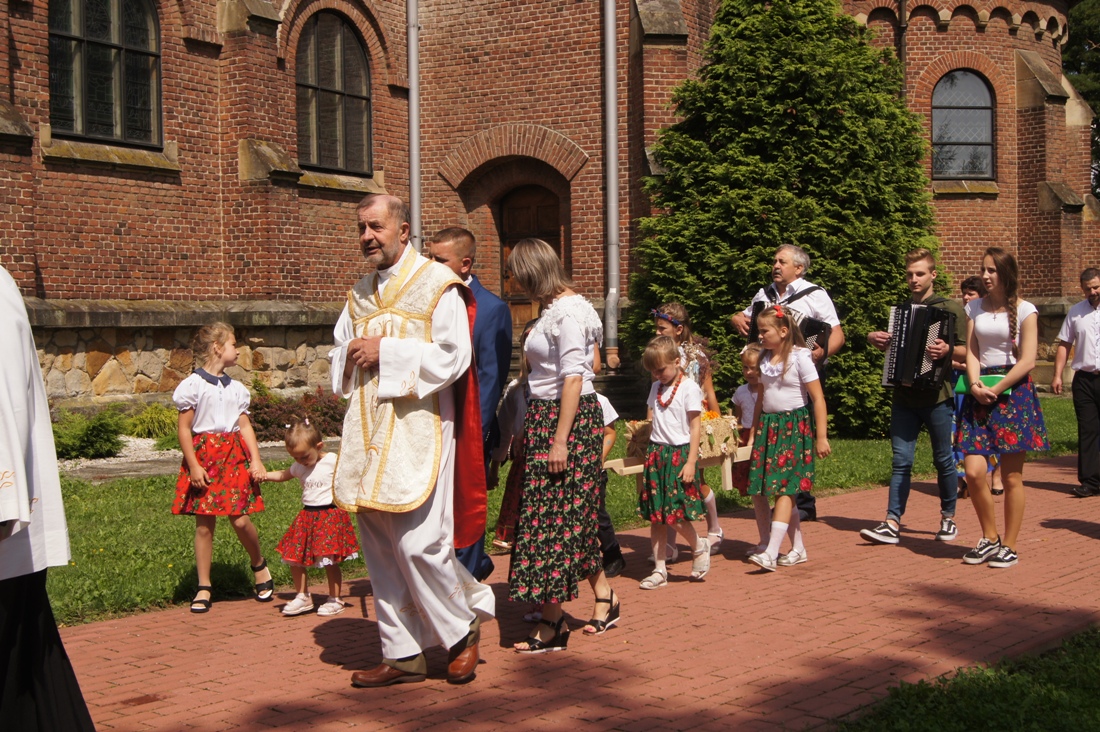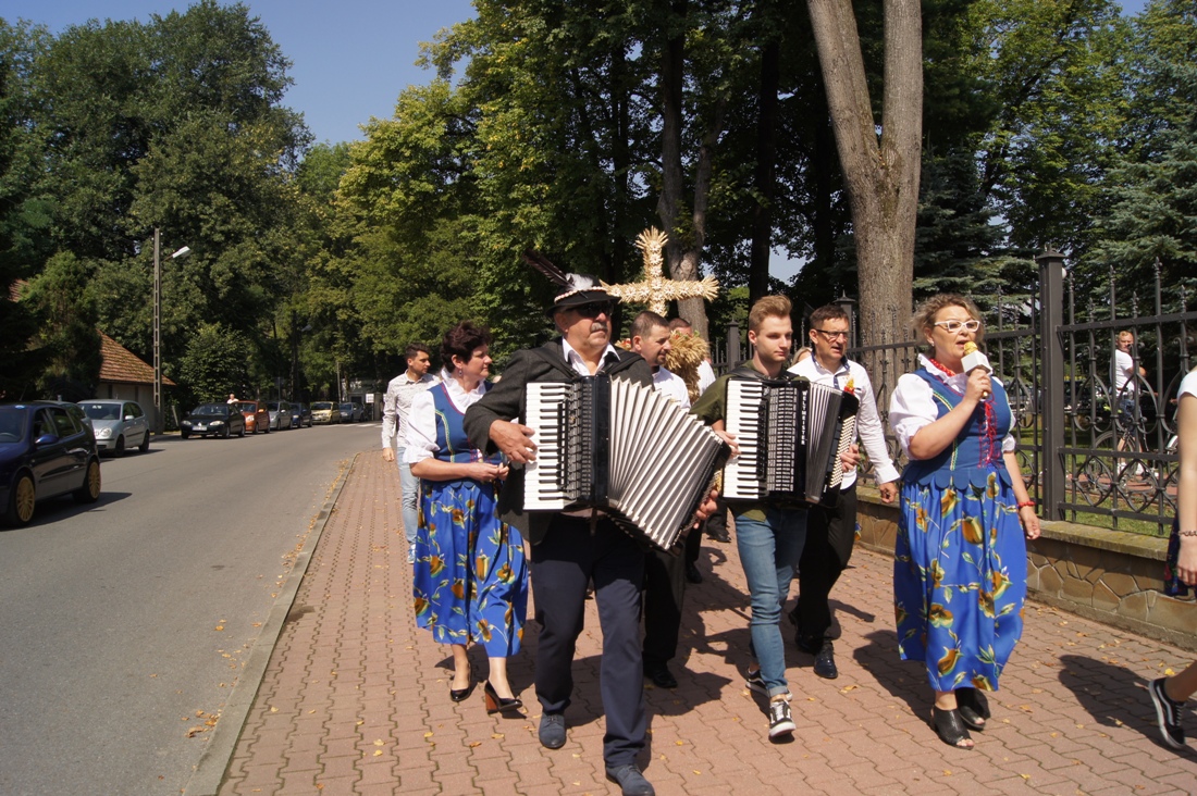 Przy dźwiękach akordeonistów Marka Rozmusa i Michała Szmyda, wesoło śpiewając pieśni maryjne i dożynkowe dotarliśmy do Kościoła. Przy akompaniamencie naszych akordeonistów śpiewaliśmy pieśni podczas Procesji