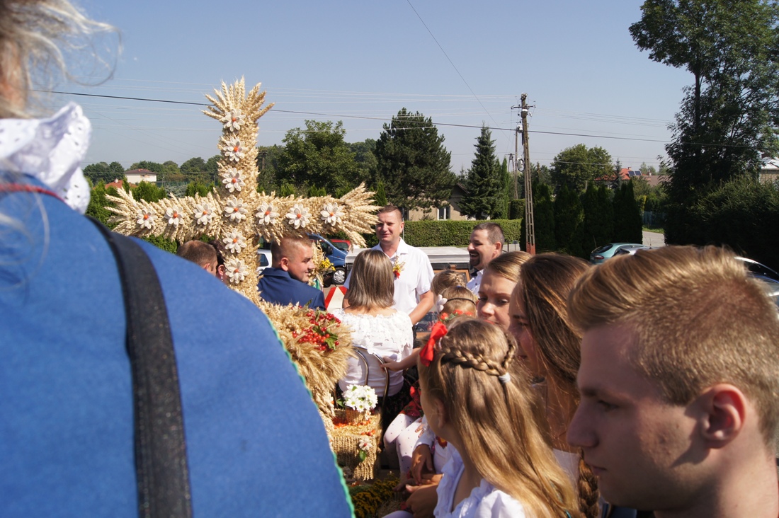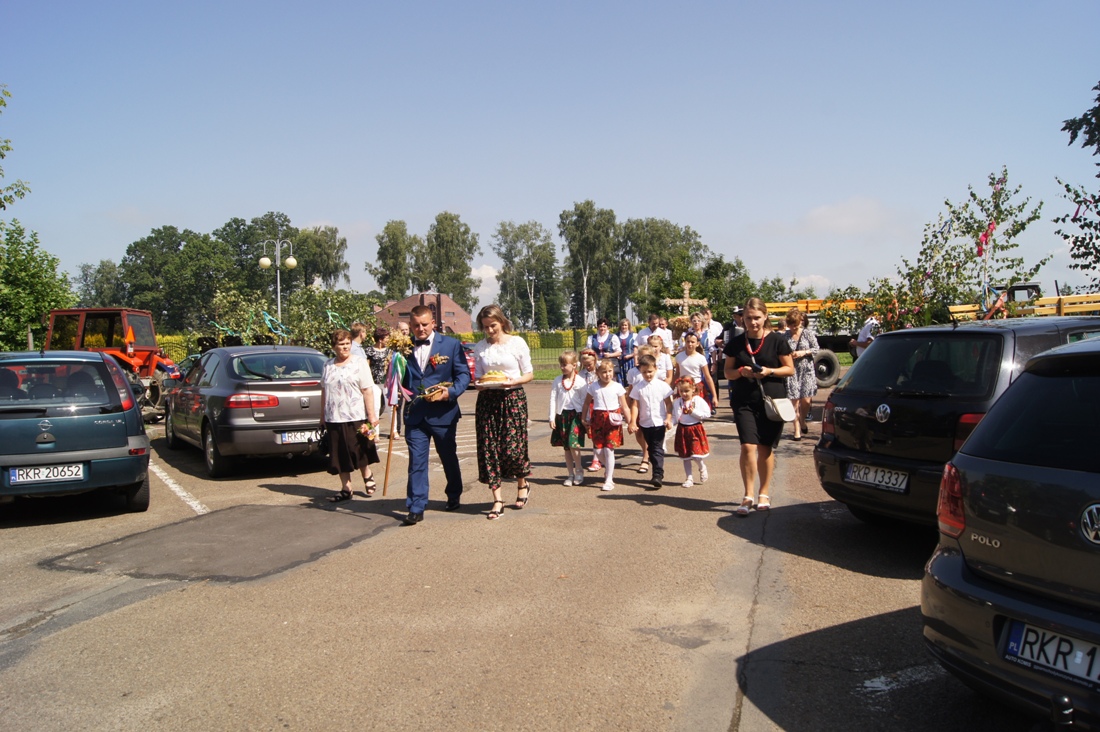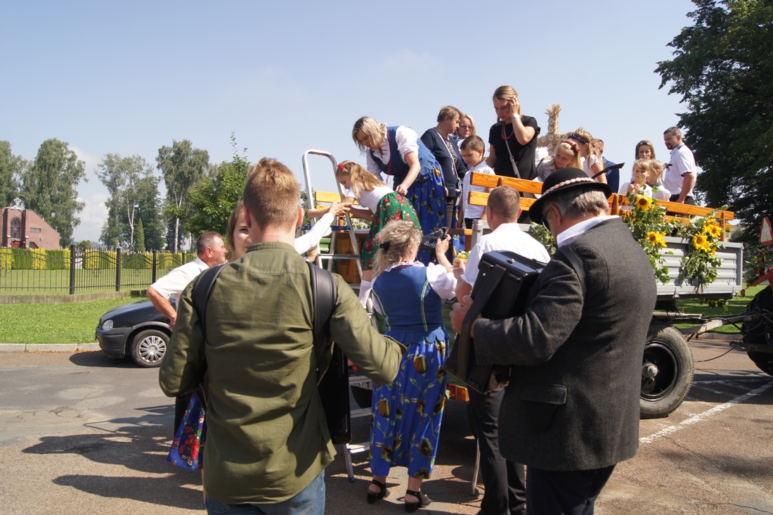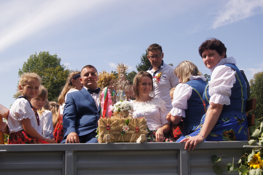 z wieńcami dożynkowymi z naszej parafii. Wracając z Kościoła ze śpiewem i muzyką wykonaliśmy przejazd dookoła naszej miejscowości, przesyłaliśmy pozdrowienia wszystkim, którzy wychodzili z domów by przywitać poświęcony „Plon Boży”. Dziękujemy Pani Irenie Bielańskiej oraz Wojciechowi Tomkiewiczowi i jego rodzinie za dary przekazane nam podczas przejazdu, a wszystkim mieszkańcom za to, że podtrzymując tę tradycję razem z nami uczcili piękne Święto Plonów zarówno podczas przejazdu jak i na imprezie dożynkowej. Dziękujemy bardzo Agnieszce Bobrowskiej za jej wydatną pomoc w napisaniu i realizacji projektu