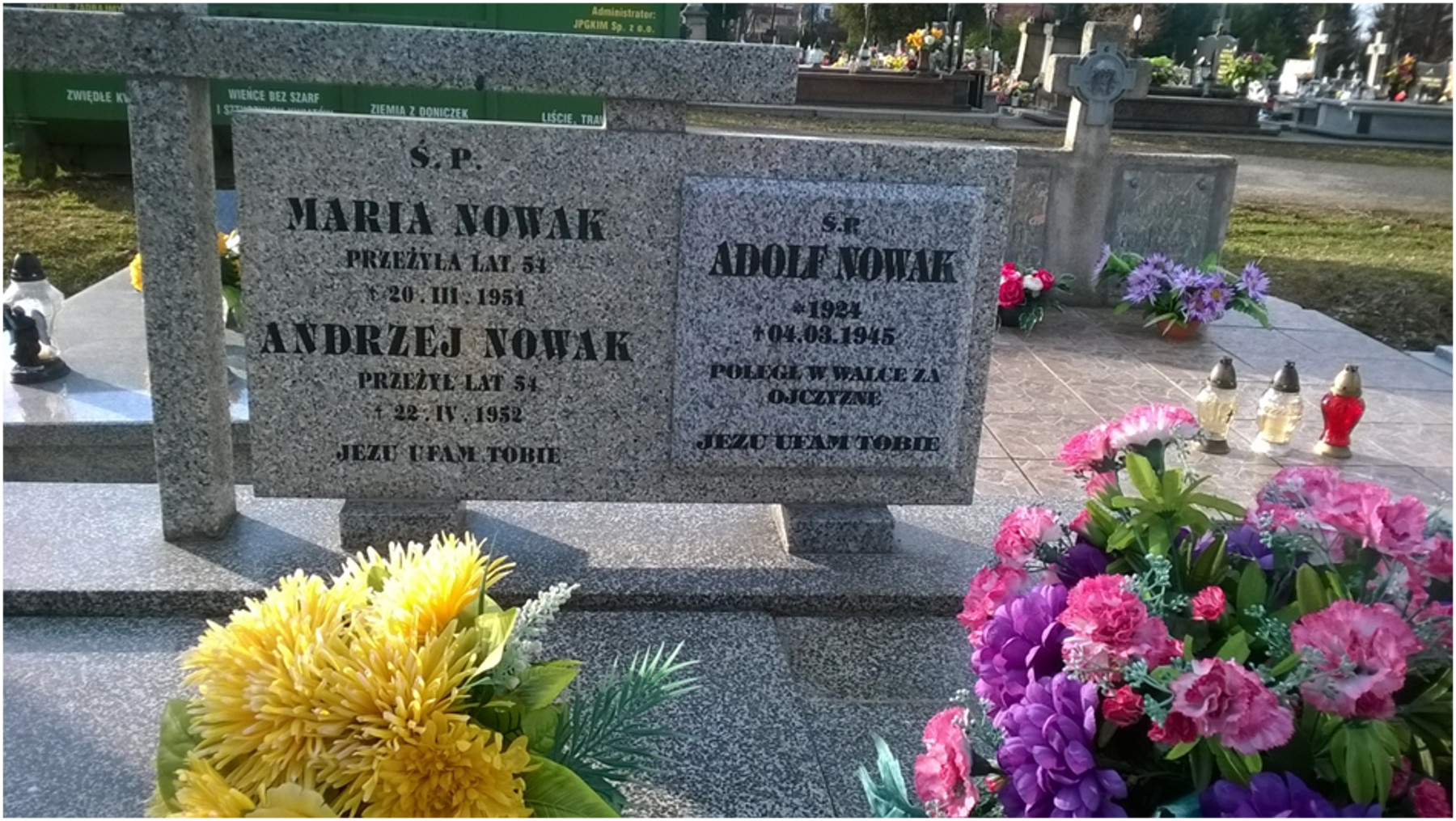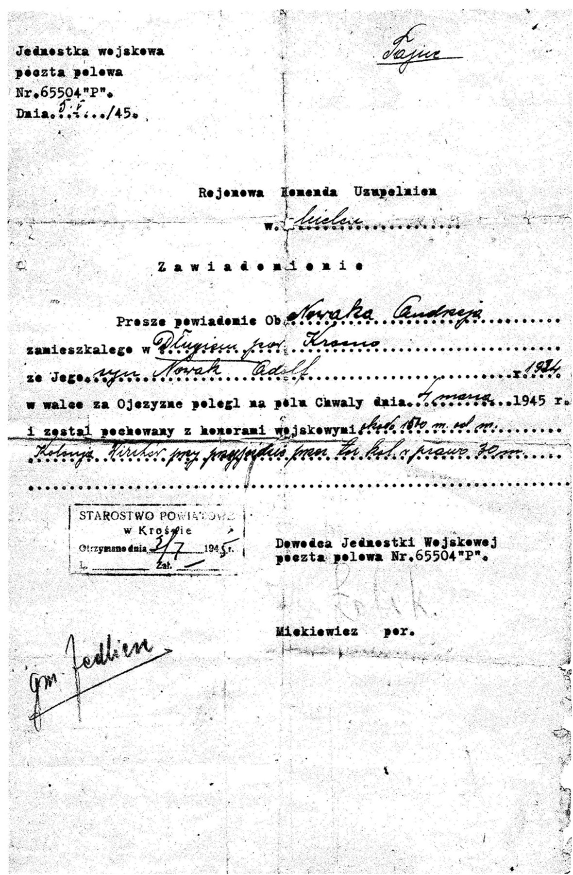 w kierunku Wierzchowa i Złocieńca. Było to ostatnie zadanie bojowe Adolfa Nowaka, bo podczas walk o Wierzchowo, dnia 4 marca 1945r., w walce za Ojczyznę poległ na polu Chwały i został pochowany z honorami wojskowymi przy przejeździe kolejowym ok. 1,5 km od Wierzchowa (niemiecka nazwa tej miejscowości: Virchow ). Po zakończeniu działań wojennych jego ciało zostało ekshumowane i złożone w żołnierskiej mogile na cmentarzu wojennym w Wałczu, a rodzina na grobie jego rodziców na jedlickim cmentarzu umieściła pamiątkową tablicę.